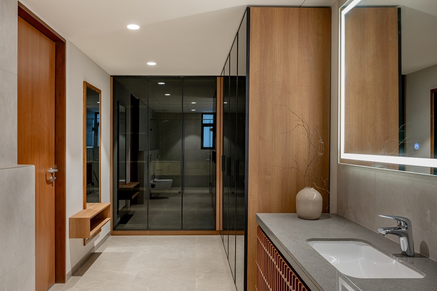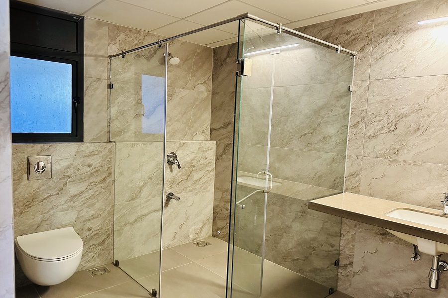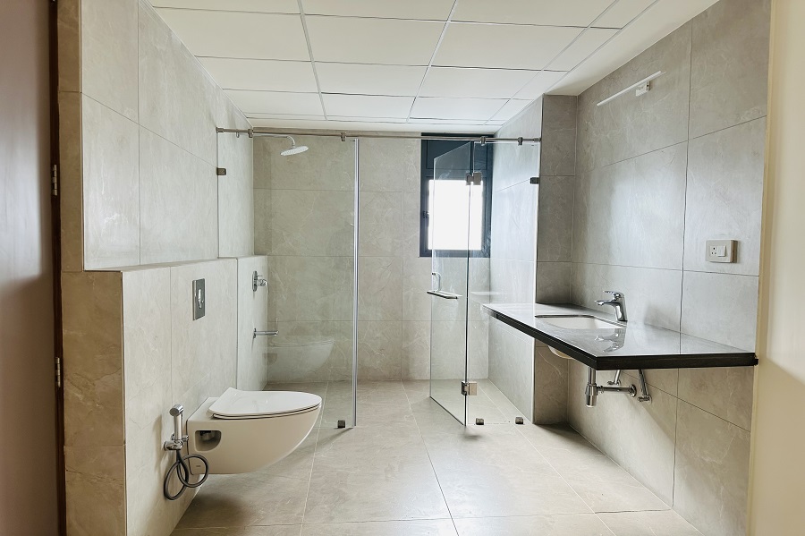 toilets: Vitrified tiles for floor and back splash. Premium quality bath fitting and sanitary ware.