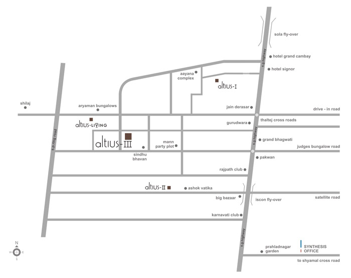 Synthesis ALTIUS III Ahmedabad is a contemporary residential project developed by Synthesis Spacelinks Pvt. Ltd. at S.G. Road, Ahmedabad. It comprises of low rise buildings. It offers 3/4 BHK apartments with size ranging from 3700 sq. ft. to 3760 sq. ft.