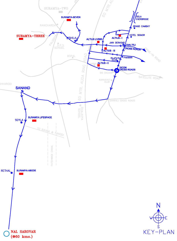 SURAMYA – THREE offers N.A. plots admeasuring approximately 550 sq. yds. (460 sq. mts) and above, only 15-20 minutes driving time from the prime S.G.Road, and around 10-15 minutes from the 60 mts. Ring road. Abutting the Sanand – Kalol highway, SURAMYA – THREE can be an excellent weekend getaway and as well a place you can call home.